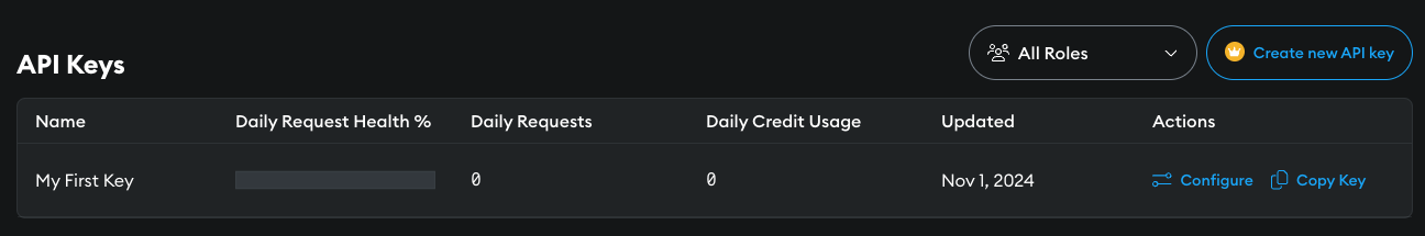 In the All Endpoints tab that displays, all network endpoints are enabled by default, and you can view your API key.